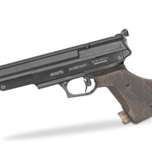 La Gamo Compact es una pistola de aire pre-comprimido ideal para quienes quieren iniciarse en el mundo del tiro de precisión con aire comprimido a 10 metros, una pistola equilibrada y precisa que reúne todo lo que podemos desear en un arma de competición. Una de las particularidades de esta pistola es su sistema de carga manual por bombeo top lever. Abatiendo la parte superior de la pistola hacia adelante cargaremos el pistón de aire pre-comprimido que nos permitirá poder ejecutar un disparo cuando queramos, un sistema de lo más preciso con ausencia de vibraciones y retroceso. La Compact tiene un peso y unas dimensiones similares a las armas de competición y dispone de una empuñadura anatómica con apoya mano ajustable, para asegurar la mejor adaptación de la mano del tirador, la empuñadura es diestra y está fabricada en madera de nogal y con la superficie picada para un óptimo agarre. Disparador de dos tiempos regulable y gatillo ajustable en orientación. Incorpora miras abiertas regulables en deriva y en altura. Calibre 4.5 mm.