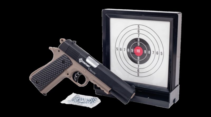 Practica tiro con tiro a la antigua usanza en casa con el kit de pistola Crosman Classic 1911, una pistola de aire comprimido simple con acción de resorte y un kit de objetivo. Incluye una pistola de aire comprimido de tamaño realista, una diana de gel enmarcada y 250 bolas de acero, ¡para que puedas empezar a disparar nada más sacarlo de la caja! Con una velocidad máxima de 200 fps, este pequeño shooter es perfecto para disparar en el patio trasero o en el sótano. La pistola presenta una combinación de colores bitono negro/tierra oscura plana, riel Picatinny para accesorios, escamas con patrón de agarre de golf para un agarre extra seguro, gatillo esqueletizado y martillo de anillo. Apriete el gatillo de este pequeño y práctico kit de práctica de tiro hoy y mantenga su puntería a una fracción del costo de alcanzar el rango.