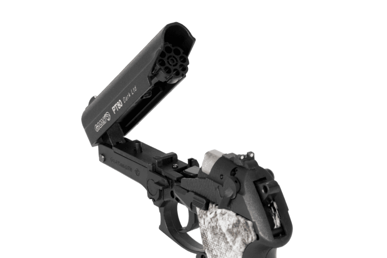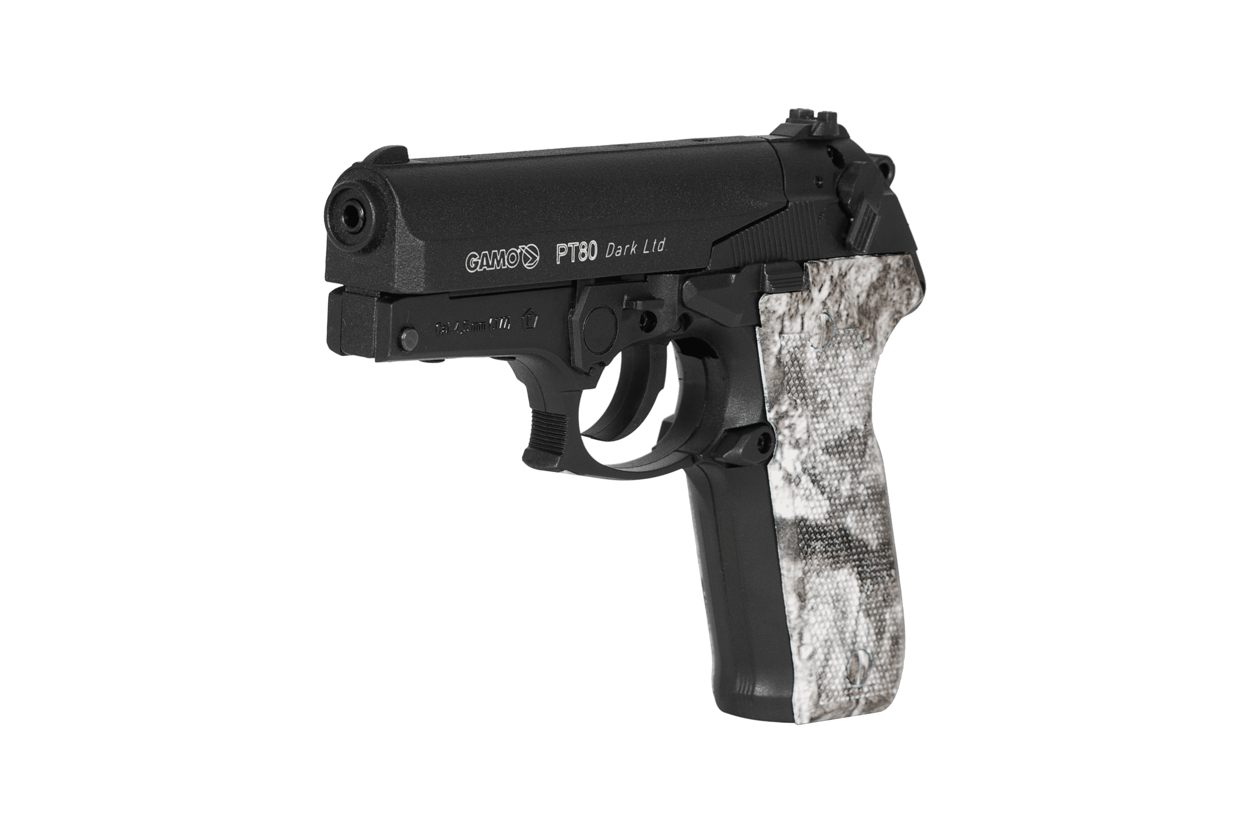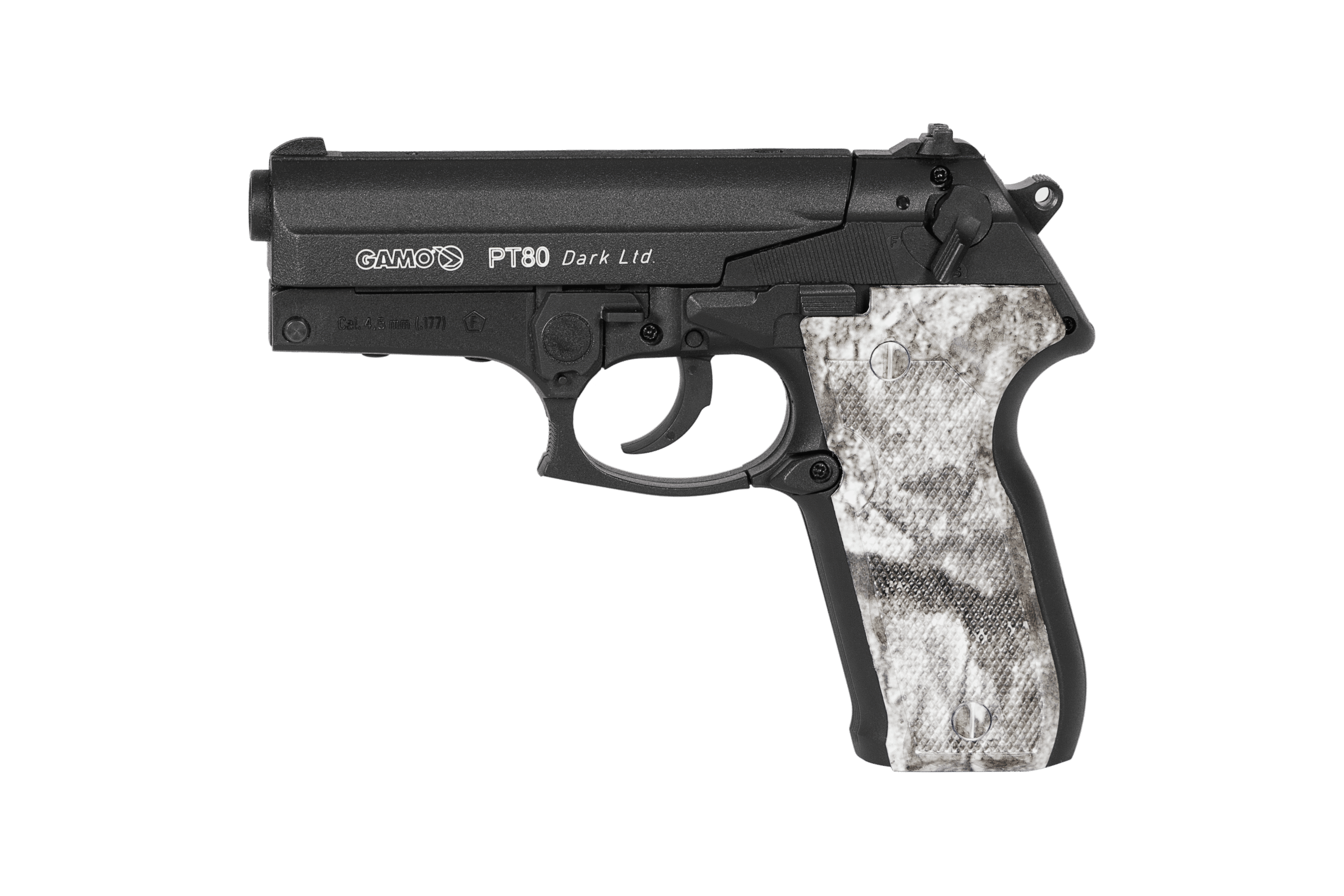 La belleza hecha Pistola. La pistola PT-80 Dark es una pistola de aire comprimido de CO2 con exclusividad para el mercado español. Una joya de la marca Gamo que brilla por su precisión, potencia y estética a partes iguales.