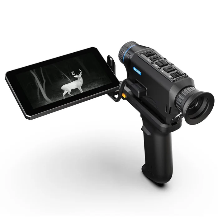 La pantalla desviada en cualquier ángulo se adapta a la mejor postura de visión, permitiendo el cambio flexible para las manos izquierda y derecha, batería 21700 extraible y reemplazable, no sólo suministra energía a la pantalla, sino que ttambién proporciona energía para los dispositivos conectados, tales como monoculares térmicos / telescopios / dispositivos de visión nocturna, ampliando en gran medida el tiempo de trabajo de todo el conjunto de equipos.