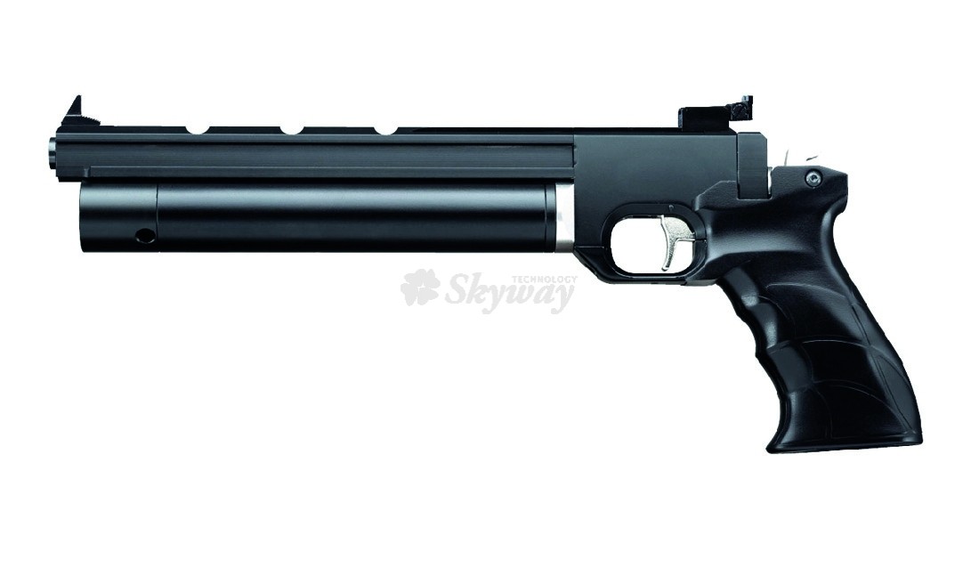 Pistola de PCP monotiro compacta y ligera. Hasta 14 julios de potencia con más de 30 disparos por carga de aire. Incluye un supresor integrado recubriendo la totalidad del cañón. Gatillo ajustable. Raíl 11mm cola de milano y alza y punto de mira incluidos.