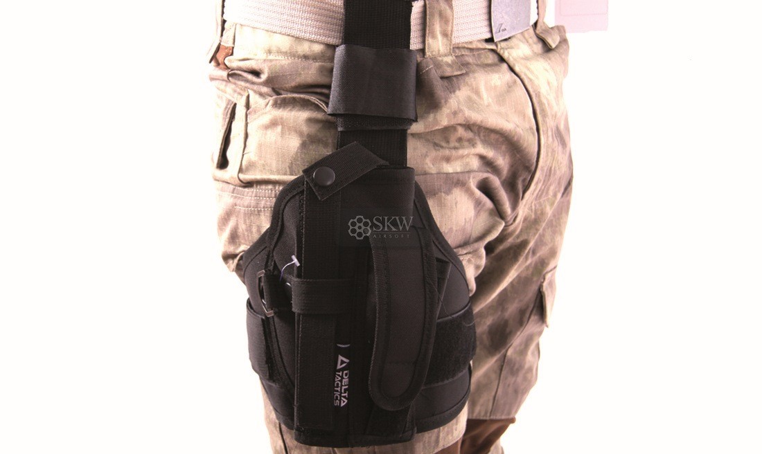 Pistolera Pernera Universal Compac Negra Delta Tactics: diseño ergonómico y seguro para uso táctico intensivo.