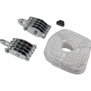 Polea de 8 poleas para cargas de hasta 300 kg. Incluyendo cuerda de PP de 20 m. El ayudante ideal tanto para subir animales como los dispensadores de comida para los cebaderos Fácil de plegar y transportar.