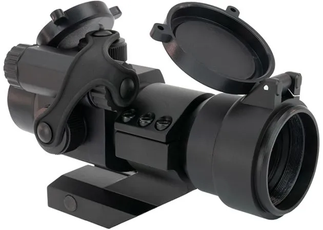 El Aim-O M2 Red/Green Black es un punto rojo liviano con una lente de 32 mm. Esta lente ofrece una imagen clara y un amplio campo de visión. En la parte delantera y trasera hay prácticas cubiertas abatibles que protegen las lentes contra daños cuando el punto rojo no está en uso.