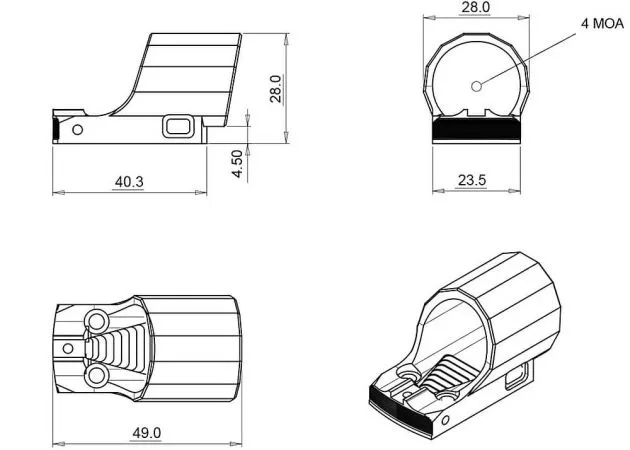 La carcasa de este punto rojo BUL BAO-1 de 4 MOA está fabricada en aluminio 6061-T6 anodizado en negro que resiste bien los impactos. El objetivo tiene un diámetro de 23,5 x 21 mm y la carcasa tiene una longitud de 49 mm. Todo este punto rojo no pesa más de 23 gramos, lo que significa que apenas pesará en el arma en la que está montado.