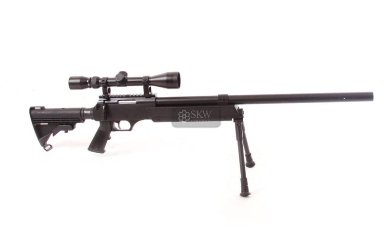 Rifle de cerrojo con muelle, mira y bípode integrado. Precisión máxima a 500 fps, diseño negro táctico. Ideal para tiro profesional.