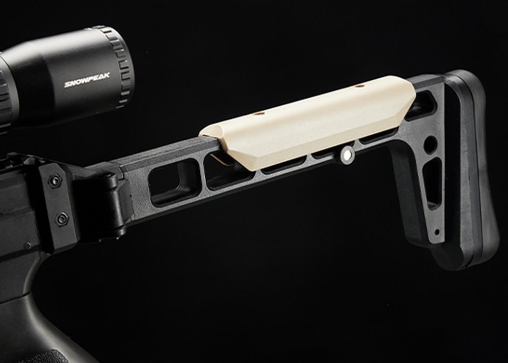 Su bajo peso (solo 2,6 kg) se puede atribuir al uso de piezas sintéticas de alta calidad y una cubierta de cañón de carbono. La culata plegable de la Snowpeak AP1000B Mercury CFB es sintética y esqueletizada, con una almohadilla de goma para la culata. Junto con la empuñadura de goma tipo pistola estilo AR-15, esta culata garantiza comodidad y control al usar el fusil. Un seguro para el pulgar añade aún más facilidad de uso.