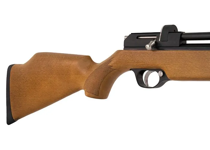 El gatillo es ajustable en dos etapas, el gatillo se puede ajustar de 0,5 a 4 libras (0,2 a 1,8 kg). El depósito de aire de 100 cc es bueno para docenas de disparos, y la culata de haya europea presenta áreas a cuadros en la empuñadura y la guarda, una carrillera elevada y una culata de goma. Después de quitar el protector de rosca, se puede atornillar un silenciador para reducir el ruido de la boca del cañón.