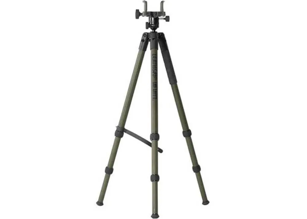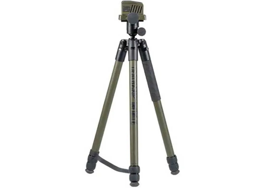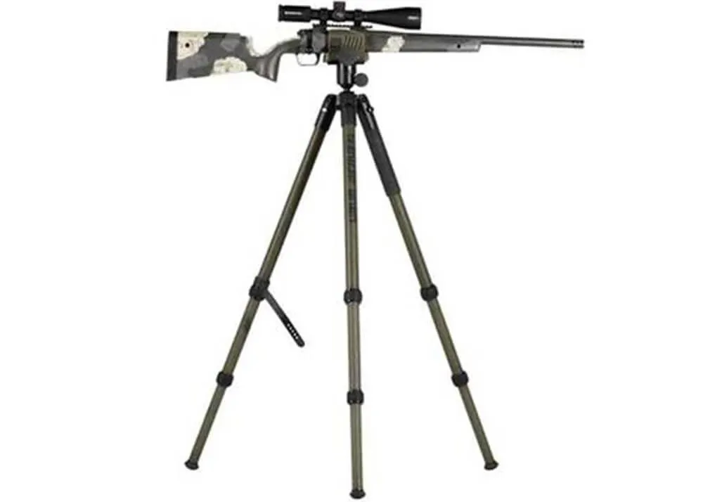 Hay un sistema de montaje Arca-Swiss debajo de la abrazadera del arma Deathgrip que puedes usar para montar fácilmente una cámara o un rifle compatible en el trípode.