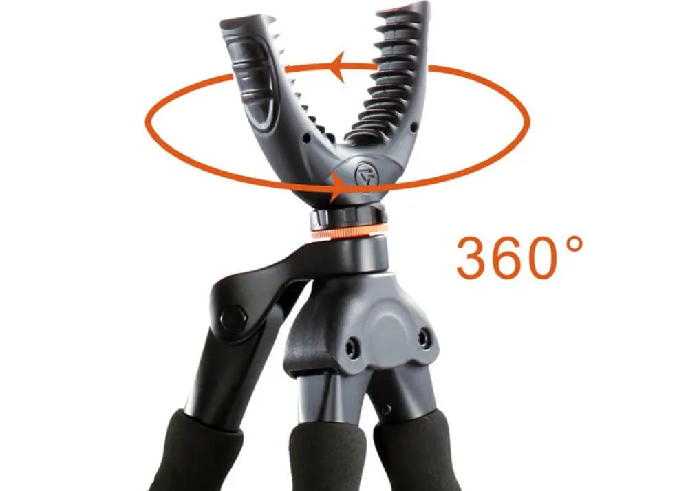 Hay pies de goma antideslizantes en los extremos de las tres patas, por lo que puede colocar firmemente el trípode Quest en una variedad de superficies diferentes. Las probabilidades de que cambie son mínimas. Tiene un perno de trípode estándar con rosca de ¼”-20 en la parte superior, que viene equipado con un yugo en forma de U. Ese yugo tiene aletas de goma en el interior de sus dos brazos que mantendrán su rifle en su lugar de forma segura. El rango de movimiento de 360 grados significa que puedes usar el yugo en forma de U para apuntar fácilmente en cualquier dirección sin perder estabilidad.