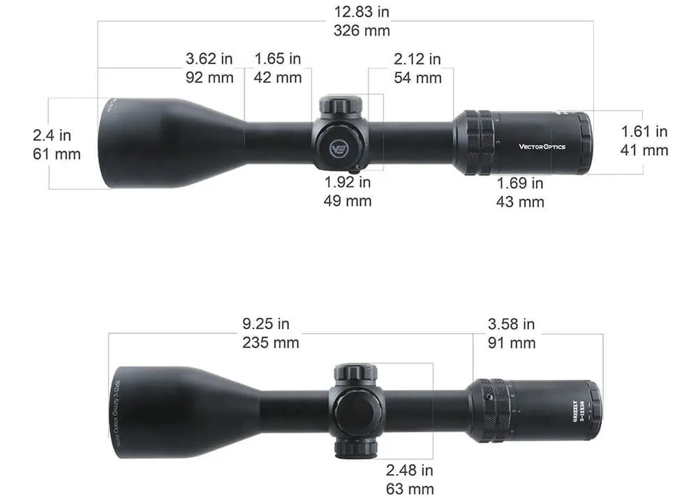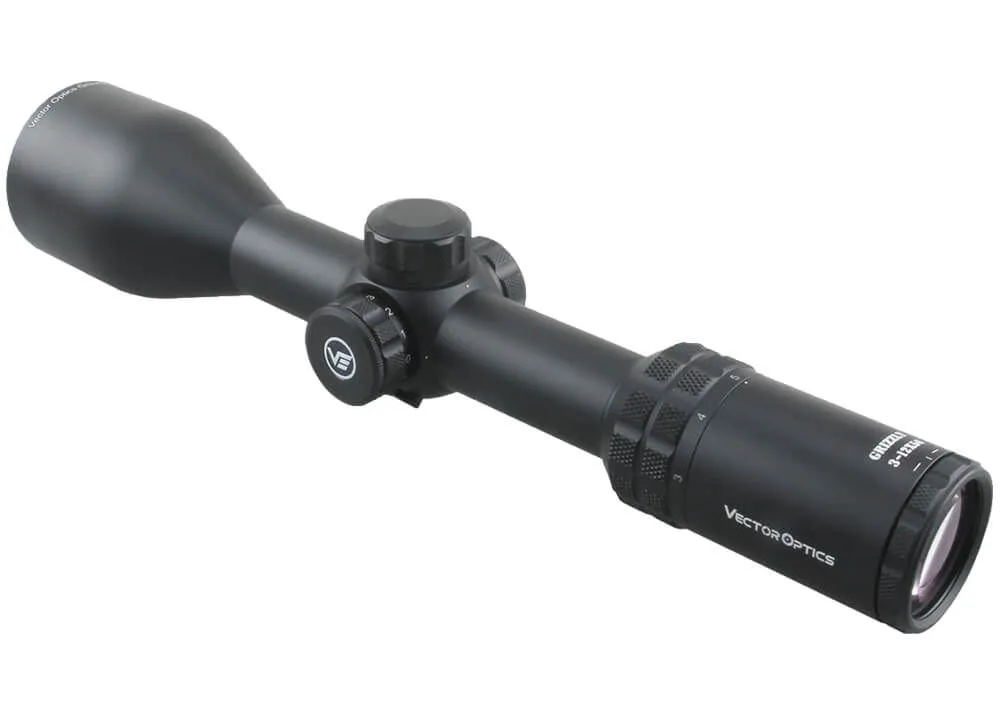 Esta mira telescópica Grizzly 3-12×56 de Vector Optics tiene una carcasa duradera que está hecha de aluminio 6061-T6 anodizado negro mate. Está purgado con nitrógeno, por lo que las lentes no pueden empañarse por dentro. El tubo tiene un diámetro de 30 mm y el objetivo tiene un diámetro de 56 mm. Como resultado, la mira telescópica tiene una transmisión de luz decente y se puede utilizar para observar al anochecer perfectamente bien. Las lentes con recubrimiento múltiple contribuyen a una excelente calidad de imagen de borde a borde. La mira telescópica Grizzly 3-12×56 de Vector Optics tiene un campo de visión de 12,23-3,06 metros a una distancia de 100 metros, dependiendo del aumento elegido. Esto se debe a que esta mira telescópica tiene un aumento mínimo de 3x y un aumento máximo de 12x.