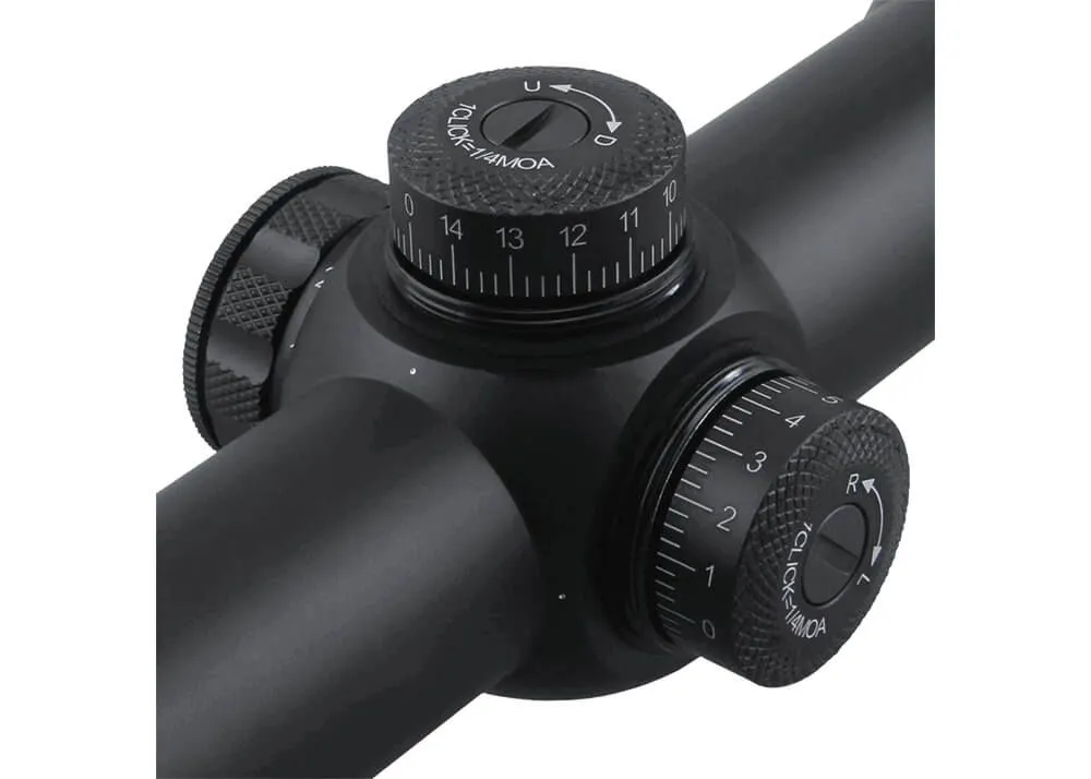 Esta mira telescópica Grizzly cuenta con una retícula alemana #4 con un punto rojo iluminado en el centro. Ese punto tiene once niveles de brillo diferentes, por lo que es claramente visible en varios fondos en todo momento. La mira telescópica Grizzly 3-12×56 de Vector Optics utiliza una pila CR2032 para alimentar esa retícula iluminada. La retícula se encuentra en el segundo plano focal, por lo que no se agrandará a medida que amplíe la imagen. Esa retícula se puede ajustar en elevación y resistencia al viento mediante el uso de las torretas. La torreta de elevación y viento tiene un ajuste máximo de 60 MOA y cada clic de las torretas representa un ajuste de 1/4 MOA.