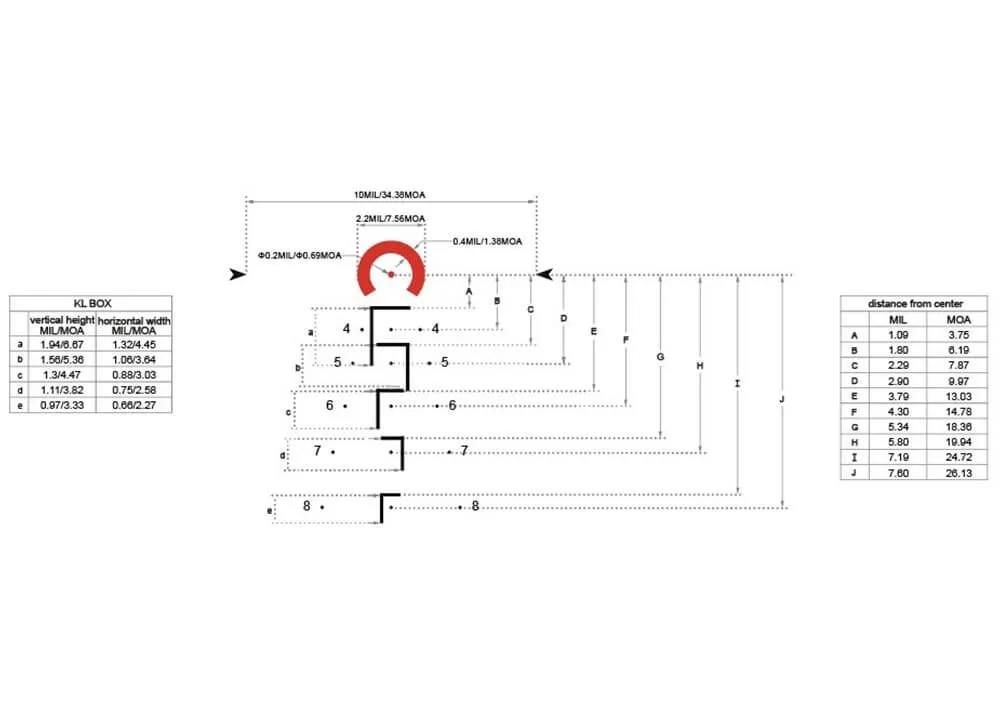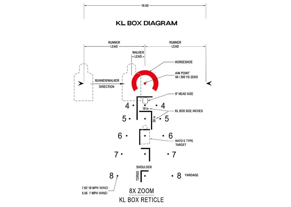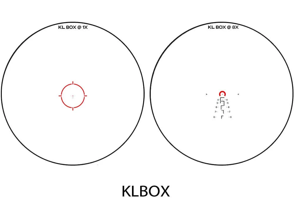 KLBOX son las siglas de Known Length Box (Caja de Longitud Conocida) e indica dónde estará el punto de impacto a ciertas yardas. Lo hace a través de fotogramas, que tienen que abrazar más o menos el objetivo. El uso efectivo de esta retícula le permite cambiar rápidamente entre objetivos a varias distancias y mantener la precisión. El centro de la retícula es un punto rojo iluminado y la retícula se encuentra en el primer plano focal, lo que significa que se hará más grande a medida que amplíe. Esto significa que las subtensiones son claramente visibles con el máximo aumento, pero son discretas con el mínimo aumento.