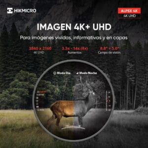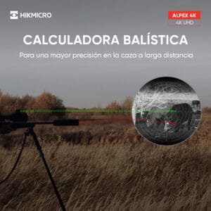 El nuevo visor digital nocturno y diurno con telémetro Alpex LRF 4K A50EL de HIKMICRO es perfecto para usar bajo cualquier condición lumínica. Disfruta de una claridad a todo color durante el día y una definida visualización clásica en blanco y negro durante la noche. Con 11 horas de autonomía, el HIKMICRO Alpex LRF 4K A50E cuenta con un sensor CMOS 3840 × 2160 UHD, una lente de 50 mm que garantiza un rango de detección de hasta 1.000 metros y una pantalla OLED sub-redonda con resolución de 1920 × 1080 y 0,49 pulgadas. También incorpora un telémetro láser de 1.000 metros de medición máxima y una precisión de ±1 m. Cuenta con calculadora balística y es perfecto tanto para la caza en el campo como en el bosque.