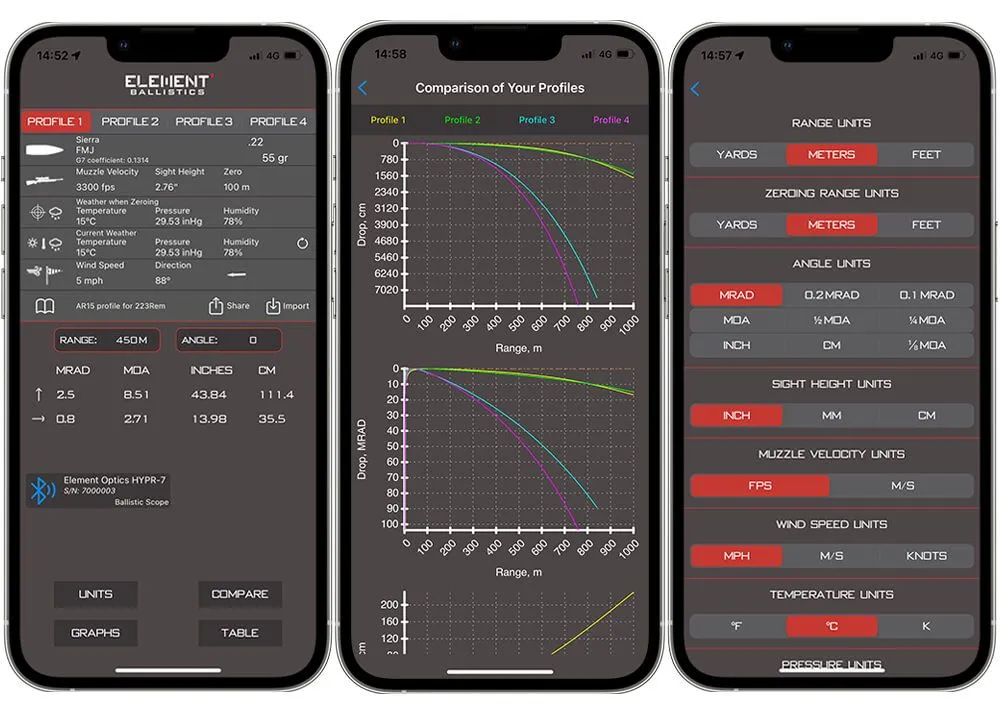 Como se dijo anteriormente, la retícula es completamente digital, lo que significa que puede elegir entre varias retículas. Incluso es posible dibujar tu propia retícula y subirla a la mira telescópica. Todo esto se puede hacer utilizando la aplicación Element Ballistics, que se puede instalar en su teléfono inteligente sin costo adicional. Podrás ajustar varias funciones del visor Element Optics HYPR-7 7×50 a través de la aplicación y todas ellas te permitirán beneficiarte al máximo de todo lo que tiene para ofrecer. Una de las características es una función de tiempo de espera, que permitirá que el visor del rifle se apague después de un período de tiempo determinado para ahorrar energía. Incluso si lo dejas encendido durante un buen rato, el visor del rifle no se agotará pronto. Una pila AAA estándar (no incluida) puede alimentarlo fácilmente durante varios días.