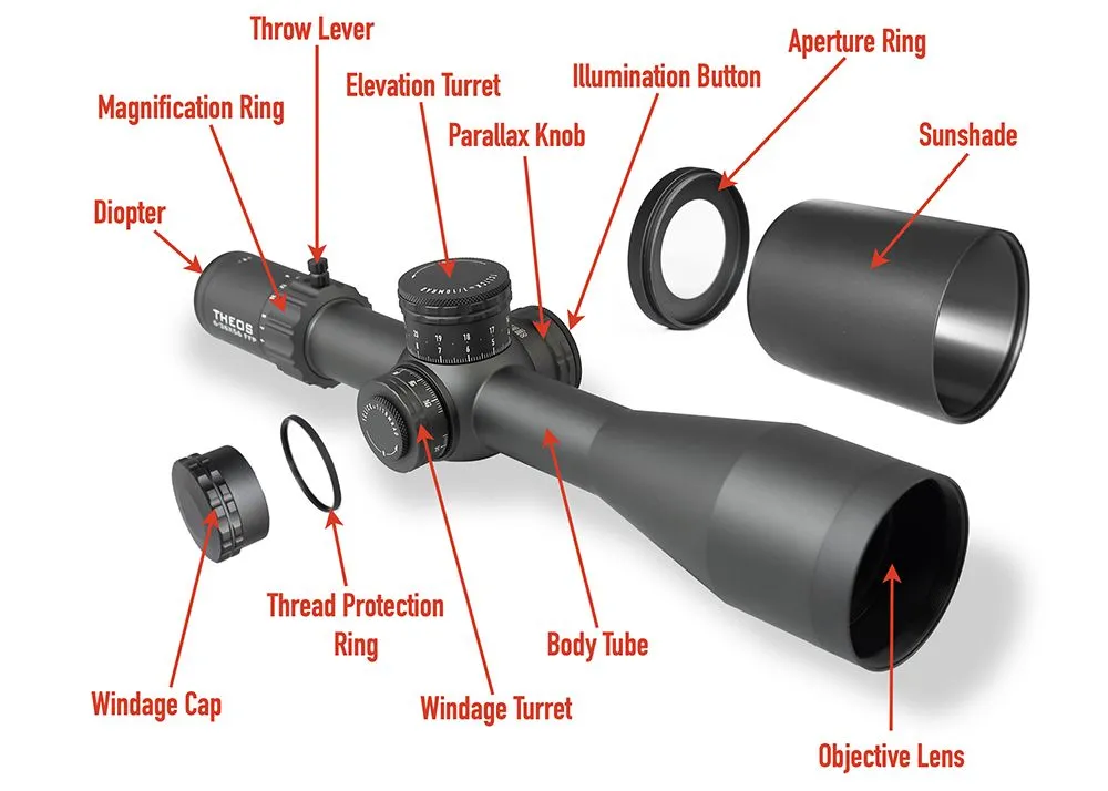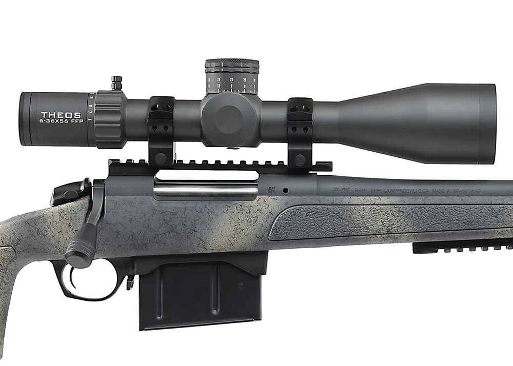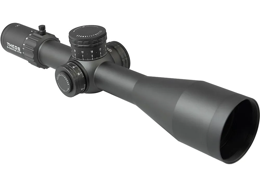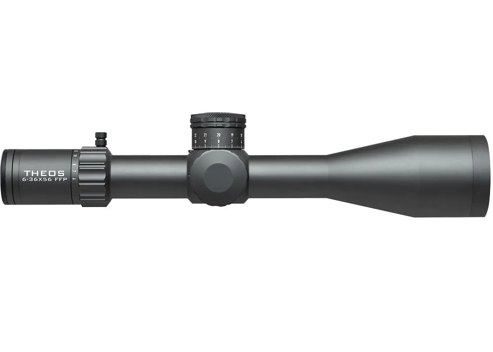 El visor Theos 6-36×56 cuenta con una retícula APR-2D Mrad FFP y, tras tres años de intenso desarrollo, es el buque insignia de la gama de visores Element Optics. Element Optics equipó el visor con un sistema de torreta renovado y zero-stop, un rango de aumento de 6-36x y un funcionamiento digital de la iluminación de la retícula.