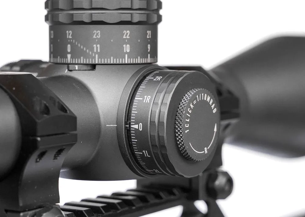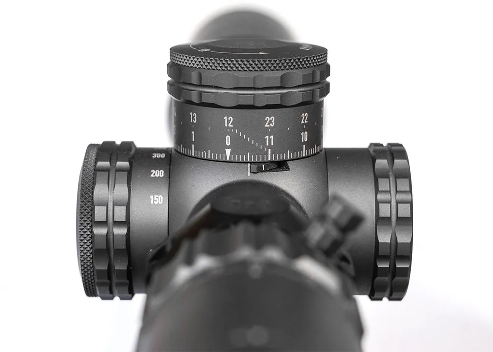 De ambas torretas reiniciables, la torreta de elevación viene con un mecanismo de parada cero renovado que retrocede 5 clics por debajo de cero cuando la torreta se gira hacia atrás por completo. El indicador de revolución muestra si la torreta de elevación está en su primera o segunda revolución, la fila superior de números se puede usar durante la segunda revolución. El paralaje se puede ajustar desde 10 yardas hasta el infinito.