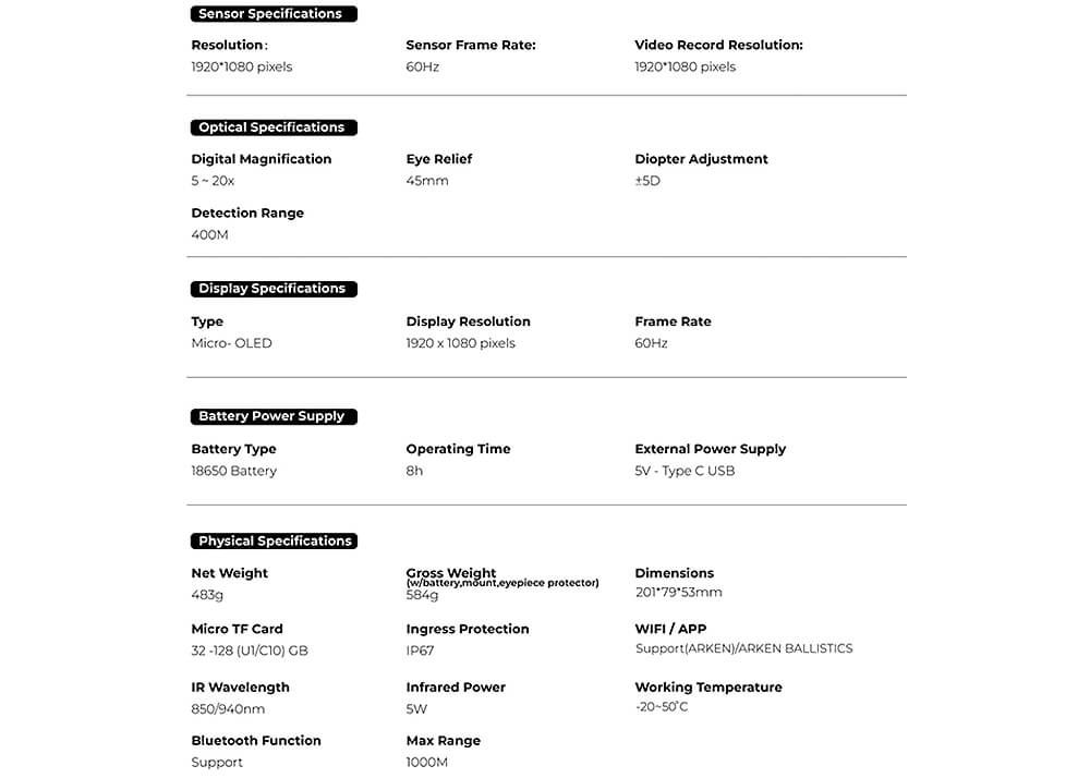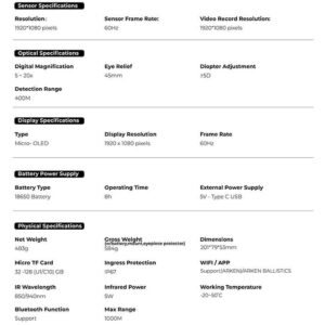 También puede almacenar los vídeos en el visor nocturno mediante una tarjeta de memoria que está disponible por separado. El visor de visión nocturna DNT Zulus HD 5-20x LRF tiene espacio para una tarjeta de memoria TF con una capacidad de almacenamiento de 32 a 128 GB. Este visor nocturno tendrá que ser alimentado por una batería 18650 que está disponible por separado. Esa batería puede alimentar el visor nocturno durante aproximadamente 8 horas y se puede cargar con un cable USB-C. Este visor nocturno DNT tiene una clasificación de impermeabilidad IP67, lo que significa que es completamente resistente al polvo. También significa que el visor se puede sumergir hasta una profundidad de un metro durante 30 minutos.