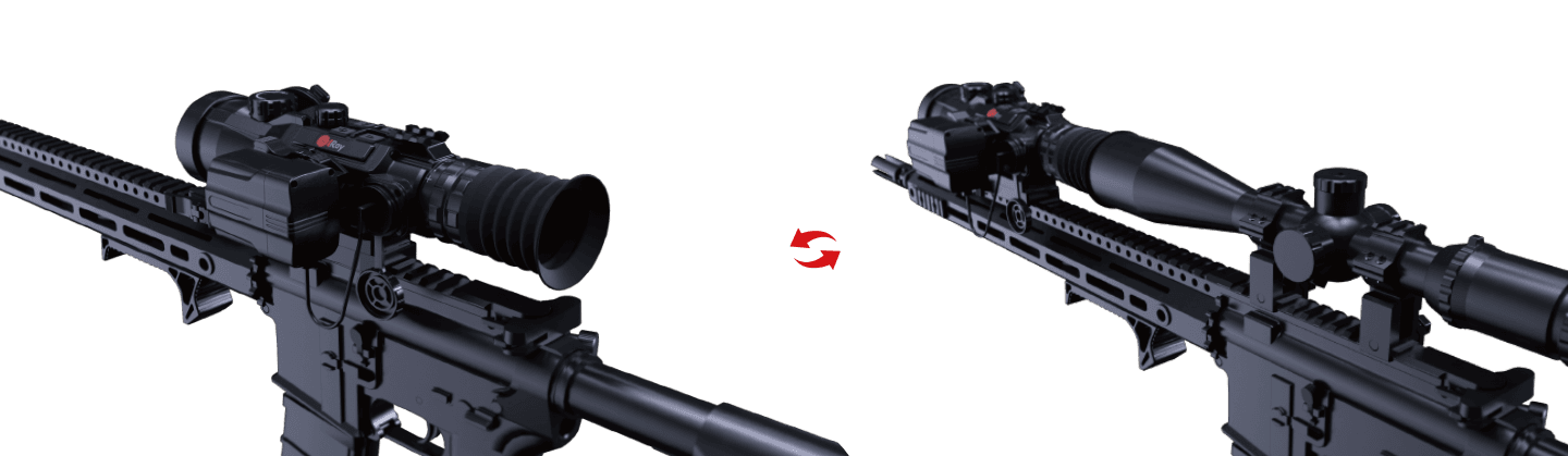 Hybrid es compatible tanto con el visor de rifle como con el modo de clip. Los dos modos se pueden cambiar en segundos sin cambiar el ocular.