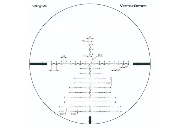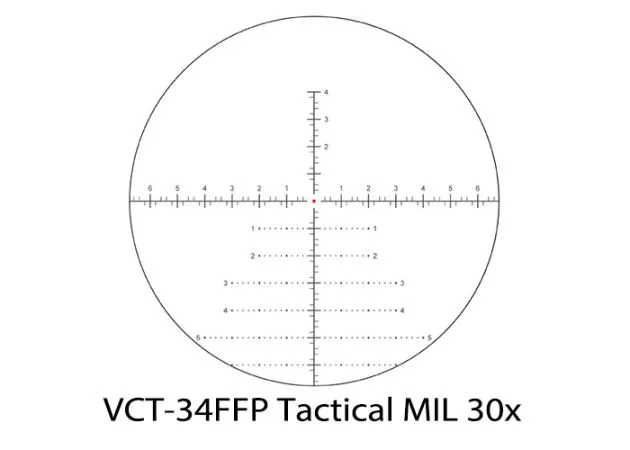 El visor táctico MIL Vector Optics Continental 5-30×56 VCT-34FFP tiene un rango de aumento de 5 a 30 veces, lo que lo hace ampliamente utilizable. Y debido a que la retícula está grabada (a prueba de golpes) en el primer plano focal, las versátiles marcas MIL (MRAD) se pueden usar con cualquier aumento para calcular la distancia y la ventaja adicional es que, cuando apunta por encima o por debajo de los objetivos, las mismas subtensiones. también se puede utilizar.