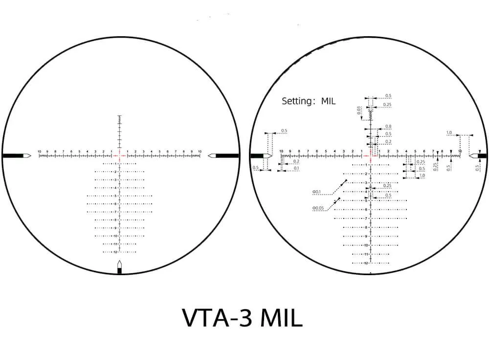 La mira telescópica Taurus 4-16×44 HD de Vector Optics utiliza una retícula VTA-3 MIL, que se encuentra en el primer plano focal. Esto significa que se hará más grande a medida que amplíe la imagen, por lo que las subtensiones se pueden utilizar con el máximo efecto. Esa retícula presenta un punto rojo iluminado en el centro y tiene seis niveles de brillo. Esos niveles de brillo aseguran que la retícula iluminada en rojo se pueda ver cuando se coloca sobre varios fondos. La mira telescópica utiliza una pila CR2032.