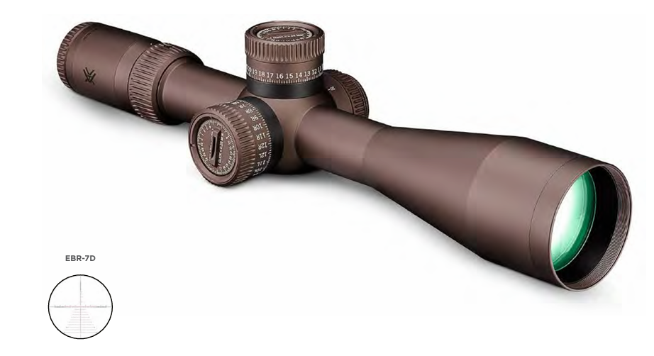 Repleto de datos de subtensión útiles para disparos de largo alcance, el EBR-7D es un retículo de rango marcado con hash disponible en el primer plano focal. Un árbol de viento en los dos cuadrantes inferiores es perfecto para correcciones de seguimiento rápidas tanto para el viento como para la elevación. La iluminación cross-plex permite una mejor usabilidad con un aumento menor.
