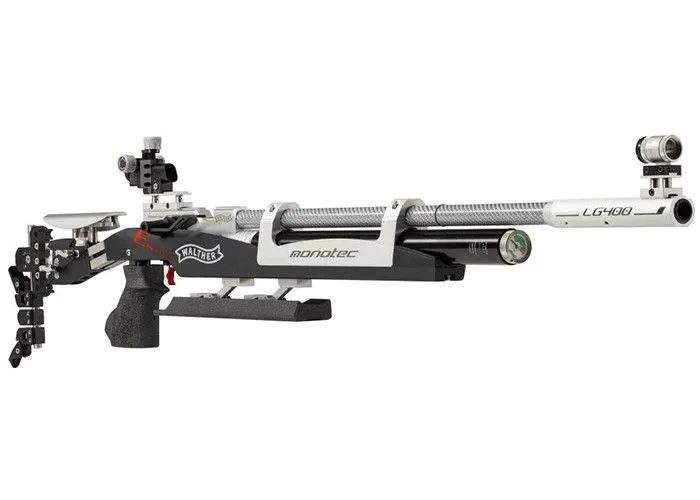 El Walther LG400-E Monotec con disparador electrónico tiene el cañón fijado en un bloque Monotec a la culata, lo que significa que el receptor en realidad está flotando y no está acoplado a un cañón flotante a la culata. La ventaja de este sistema es un efecto mucho menor de los golpes y vibraciones en el cañón y el bloque Monotec proporciona amortiguación y estabilización adicionales.